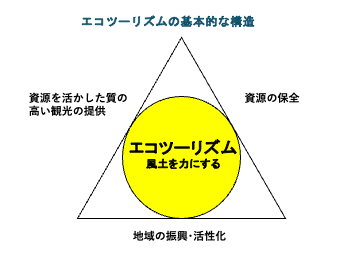 この考えを受けて、日本で考えられたのが、左図の3角形であらわされた概念で、これがエコツーリズムの基本的な構造です。